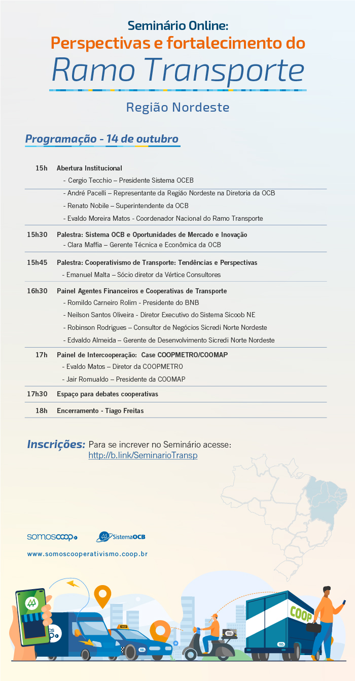 Cooperativas de taxistas, de transporte turístico, de encomendas e de cargas fazem parte do nosso cotidiano. Para debater as perspectivas de futuro e as estratégias para o fortalecimento do setor no Nordeste, o Sistema OCB vai promover um seminário online no dia 14 de outubro. O evento acontece a partir das 15h, por meio da plataforma Zoom.
